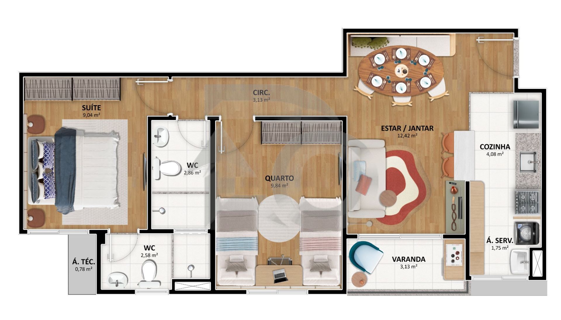 * 2 quartos, sendo 1 suíte;