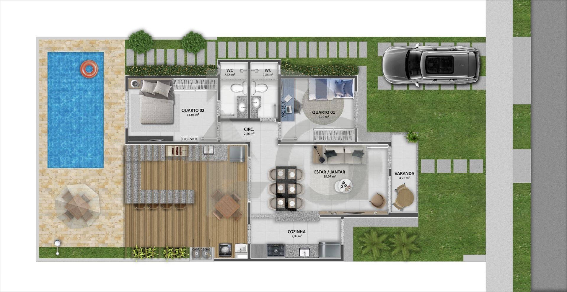 * 2 quartos, sendo 1 suíte;