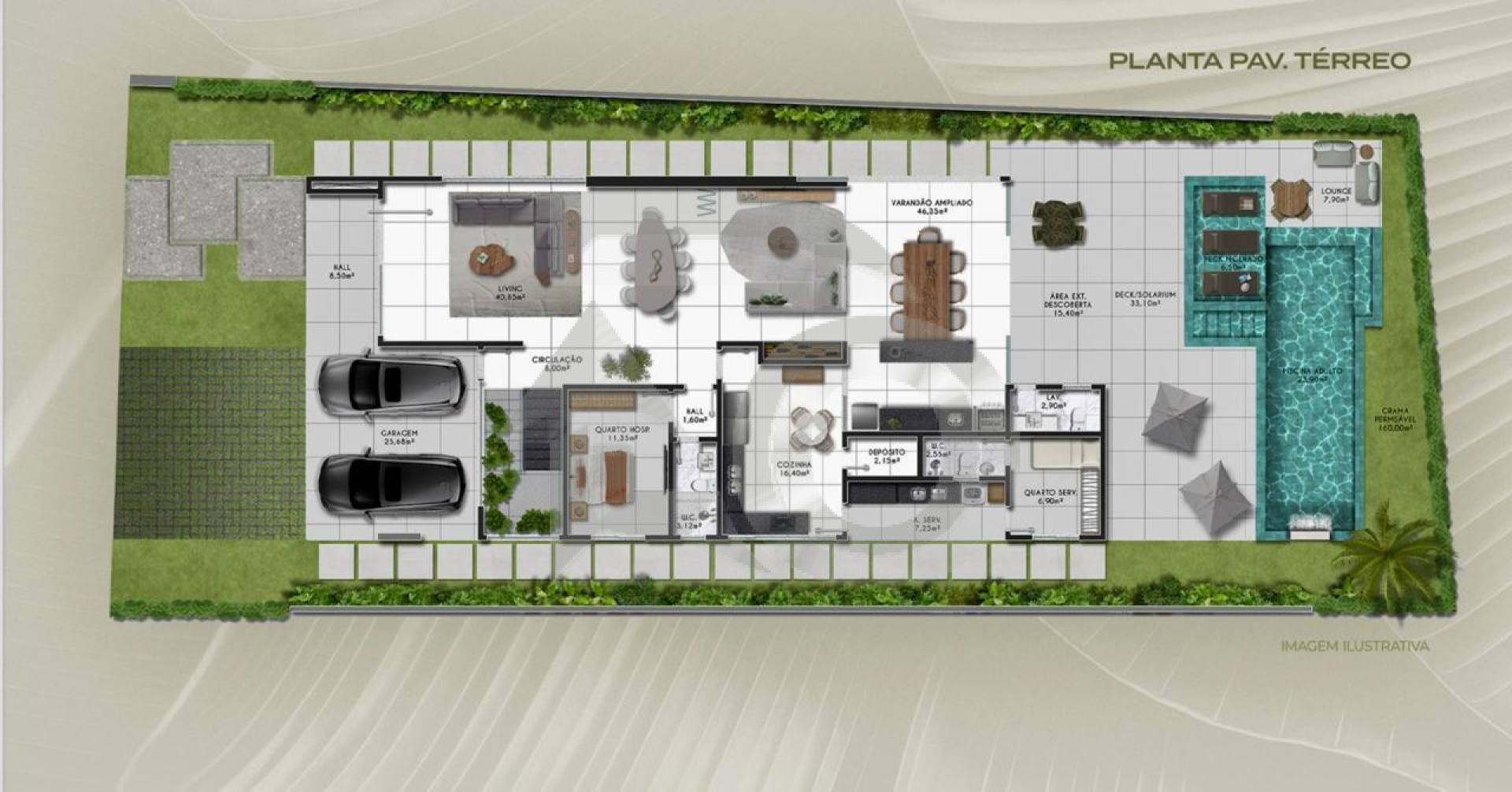 * Piscina com lounge e deck molhado;